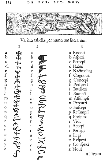 ![]() De Furtivis Literarum Notis, p. 73 Ci-dessous, la page 114 de De Furtivis Literarum Notis, présentant trois alphabets de substitution monoalphabétique.
