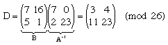 Pour trouver D, il faut calculer A-1, puis multiplier à droite les deux termes de l'équation avec A-1 (tant que A n'est pas inversible modulo 26, il faut essayer d'autres matrices A et B):