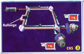 Si une seule rallonge a été mise, les chemins pris par les photons ont des longueurs différentes: tout se passe alors comme dans le cas 3 illustré ci-dessus. Quel que soit le photon envoyé par Alice, Bob a autant de chances (50%) de le récupérer dans le détecteur 0 que dans le détecteur 1. Il ne peut donc être sûr de sa mesure. Les deux correspondants vont devoir éliminer tous les bits, 0 ou 1, échangés lorsqu'ils avaient placé une seule rallonge.