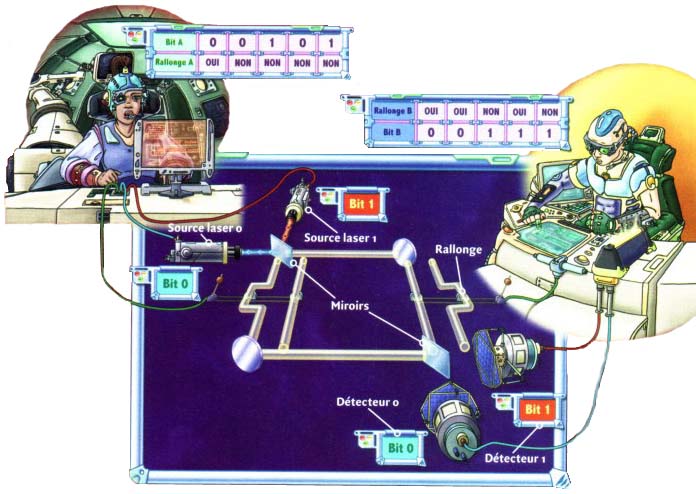 Alice envoie au hasard des photons 0 ou 1 et choisit, toujours au hasard, de placer ou non sa rallonge L. Elle note au fur et à mesure la suite de 0 et de 1 qui se constitue ainsi que la présence ou l'absence d'une rallonge. À l'autre bout de la ligne, Bob s'en remet lui aussi au hasard pour décider de placer ou non sa rallonge sur le chemin des photons avant de les récupérer. Puis il capte les photons envoyés par Alice dans les détecteurs 0 ou 1 et note le résultat.