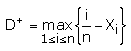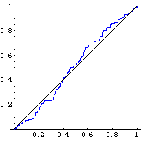 Le test de Kolmogorov-Smirnov compare la fonction de répartition uniforme avec la fonction de répartition de l'échantillon empirique. L'idée est de calculer la distance maximale (en rouge sur les graphiques) entre les fonctions théoriques et empiriques. Si cette distance dépasse une certaine valeur, qu'on lira dans un tableau, on dira que l'échantillon est mauvais.
