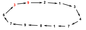 Pour k=1, un cycle apparaît dès qu'une paire de nombres consécutifs apparaît pour la deuxième fois: on voit dans l'exemple ci-dessous (en rouge les deux germes) qu'un même chiffre peut apparaître plusieurs fois avant l'apparition d'un cycle.