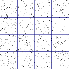 En exercice, vous prendrez k=4, ce qui donnera 16 cases, et vous générerez 1600 points (donc 3200 nombres) dont les coordonnées seront comprises entre 0 et 4 (voir exemple ci-contre).