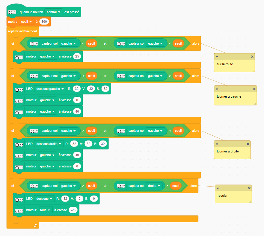 | Le capteur au sol droit est en panne... Programmez Thymio pour qu'il suive la ligne noire en n'utilisant QUE le capteur au sol gauche. |