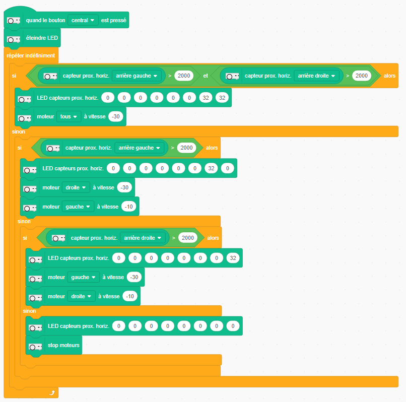 Programmez Thymio pour qu'il suive votre main, mais avec ses capteurs arrière. |