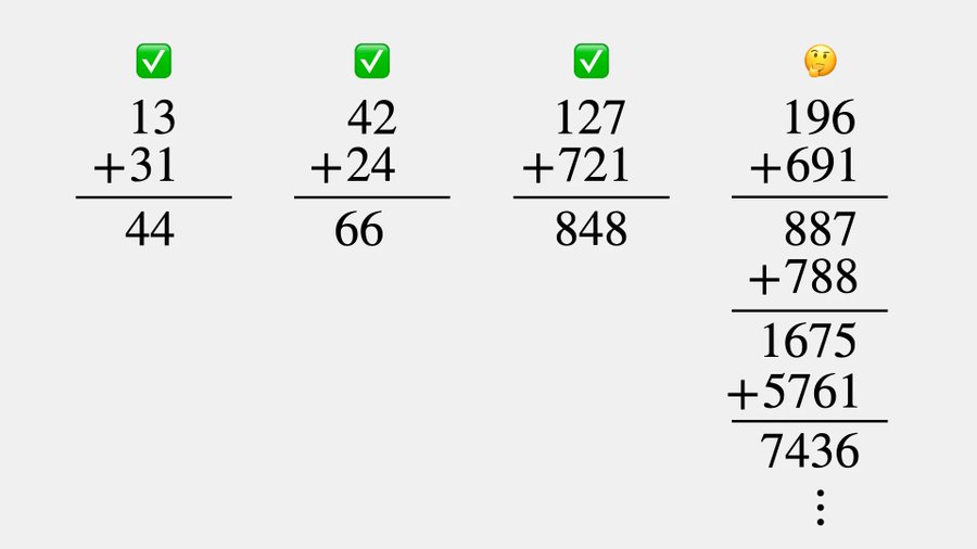 196 est le plus petit nombre pour lequel un palindrome n'a pas été trouvé par ce processus itératif.