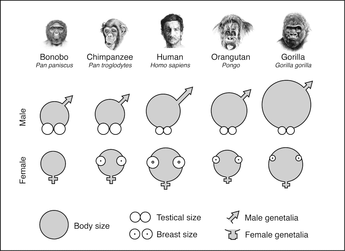 Organes sexuels des grands singes, comparés en termes de taille (les bonobos ont une poitrine plate jusqu'à ce qu'ils tombent enceintes). Mark Maslin, The Cradle of Humanity