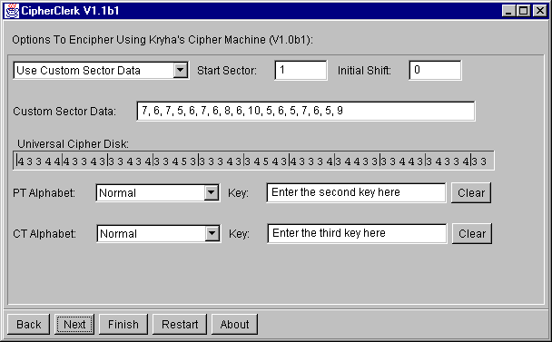 When using this cipher, first decide which cipher disk you want to use. For the original version, you may enter the number of teeth for each sector directly as a list of comma separated cardinal numbers. For the universal ciphering disk, click between to numbers to insert or remove a stop pin. A stop pin will be denoted by a white vertical line, the black one's are inserted as benchmark at every fifth possible stop pin location. Note that you must place at least one stop pin.
