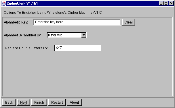When using this cipher, you need to know the (mixed) cipher text alphabet and the initial positions of the pointers. Within CipherClerk's Applet's implementation, you specify the the cipher text alphabet by a key word and an algorithm how to generate the mixed alphabet (see how a substitution is generated), while the two hands point to the first letters of the alphabet.