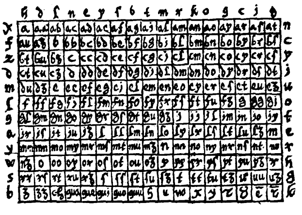 2. For the better misleading of one who should intercept the missive and the more easy discovery of the Line, you may make use of a certain number of Non-significant letters, which are always to be appended to the two transposed letters. For example, taking the first table of this chapter, which, as is seen, contains six Lines, each one of which consists of ten Columns, select at will six letters; e.g. M,P,C,D,G,H; and place against the first line M, against the second, P, against the third, C, and so on. When, then, in expressing the name Mauritius, you have, by the aforesaid device, transposed the Position MA by KW, the Non-significant letter C, which is at the head of the third Line, may be added thereto; and so the process must be continued until the secret is finished, in this form: Kwclygmpcmycaqg.