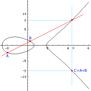 Prenons deux points A et B sur cette courbe. En général, la courbe passant par A et B recoupe la courbe en un troisième point de coordonnées (x, y). Son symétrique (x, -y) est lui aussi sur la courbe et on le désigne par A+B pour signifier qu'il est construit à l'aide de A et B. La chose surprenante est que cette opération "+" possède toutes les propriétés de l'addition des nombres. C'est-à-dire que l'on peut faire tous les calculs de type addition, soustraction et division avec un reste entier que nous faisons sur la droite des nombres réels sur cet objet tordu que constitue une courbe elliptique.