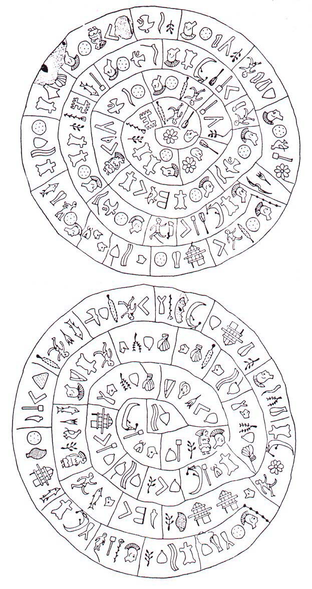 Sur une face, 122 hiéroglyphes en 31 groupes séparés l'un de l'autre par un trait vertical. Sur l'autre 199 en 30 groupes pareillement séparés. Ces hiéroglyphes ont été, non pas tracés, mais estampés (c'est le premier exemple connu)! À quoi ressemblent ces hiéroglyphes? Pêle-mêle, on y voit une tête chauve, une autre coiffée comme un Mohican, une coquille Saint-Jacques (ou un gant de baseball), une mâchoire d'âne (ou une gondole vénitienne), un bouclier rond (ou un barillet de revolver), une équerre, une colombe avec une branche d'olivier, un chrysanthème (ou une marguerite), un pressoir (ou une ruche), ... En tout, 45 signes différents.