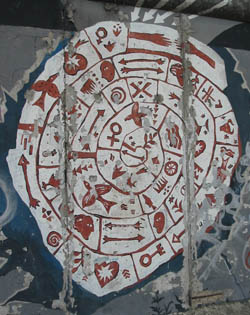 | De passage à Berlin en avril 2003, j'ai vu sur ce qui reste du Mur un motif qui m'a tout de suite fait penser au disque de Phaïstos (voir ci-contre). On remarque beaucoup de symboles de la liberté (oiseaux, flèches, clef) et de l'amitié (mains tendues, coeur, rameau d'olivier). Faut-il y voir autre chose qu'un dessin artistique? Je ne pense pas. |