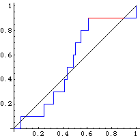 Le test de Kolmogorov-Smirnov compare la fonction de répartition uniforme avec la fonction de répartition de l'échantillon empirique. L'idée est de calculer la distance maximale (en rouge sur les graphiques) entre les fonctions théoriques et empiriques. Si cette distance dépasse une certaine valeur, qu'on lira dans un tableau, on dira que l'échantillon est mauvais.